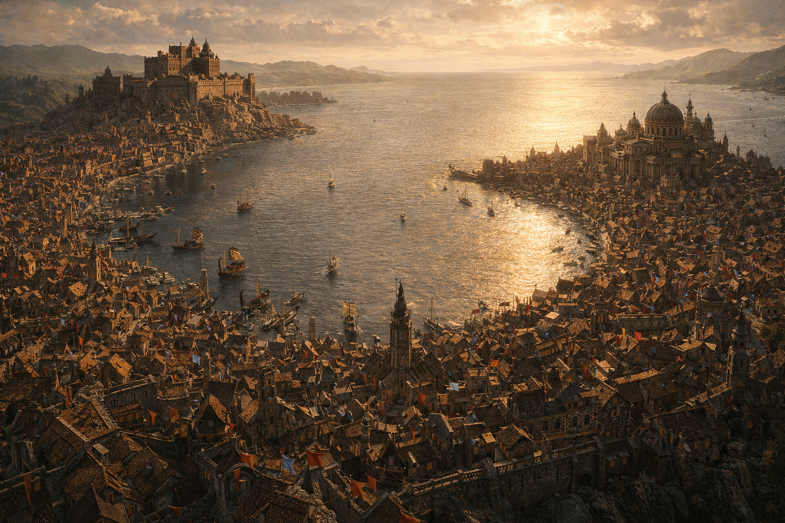 Its founders came from three directions: dwarven explorers pushing south from the League's coastal cities, imperial settlers moving east from the Ulek heartland, and representatives of the Five Royal Families of Terenei who needed sea access and found that neither the League nor the Empire was especially interested in providing it on acceptable terms. The three currents collided on a curved eastern bay and produced something none of them had planned: a city that belonged to all of them equally, which meant it belonged to no one.